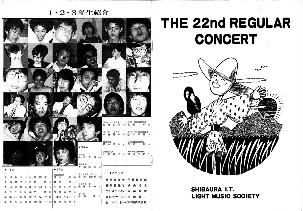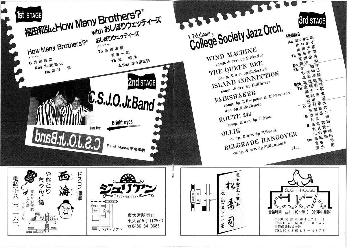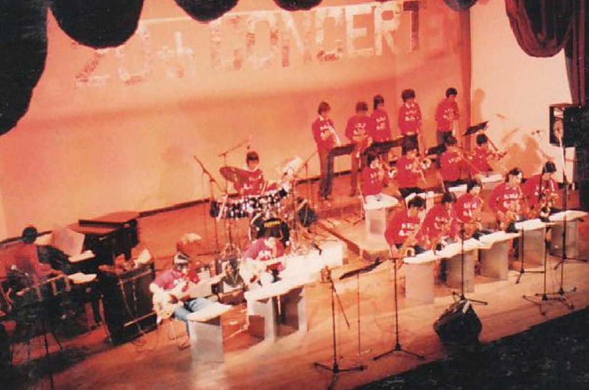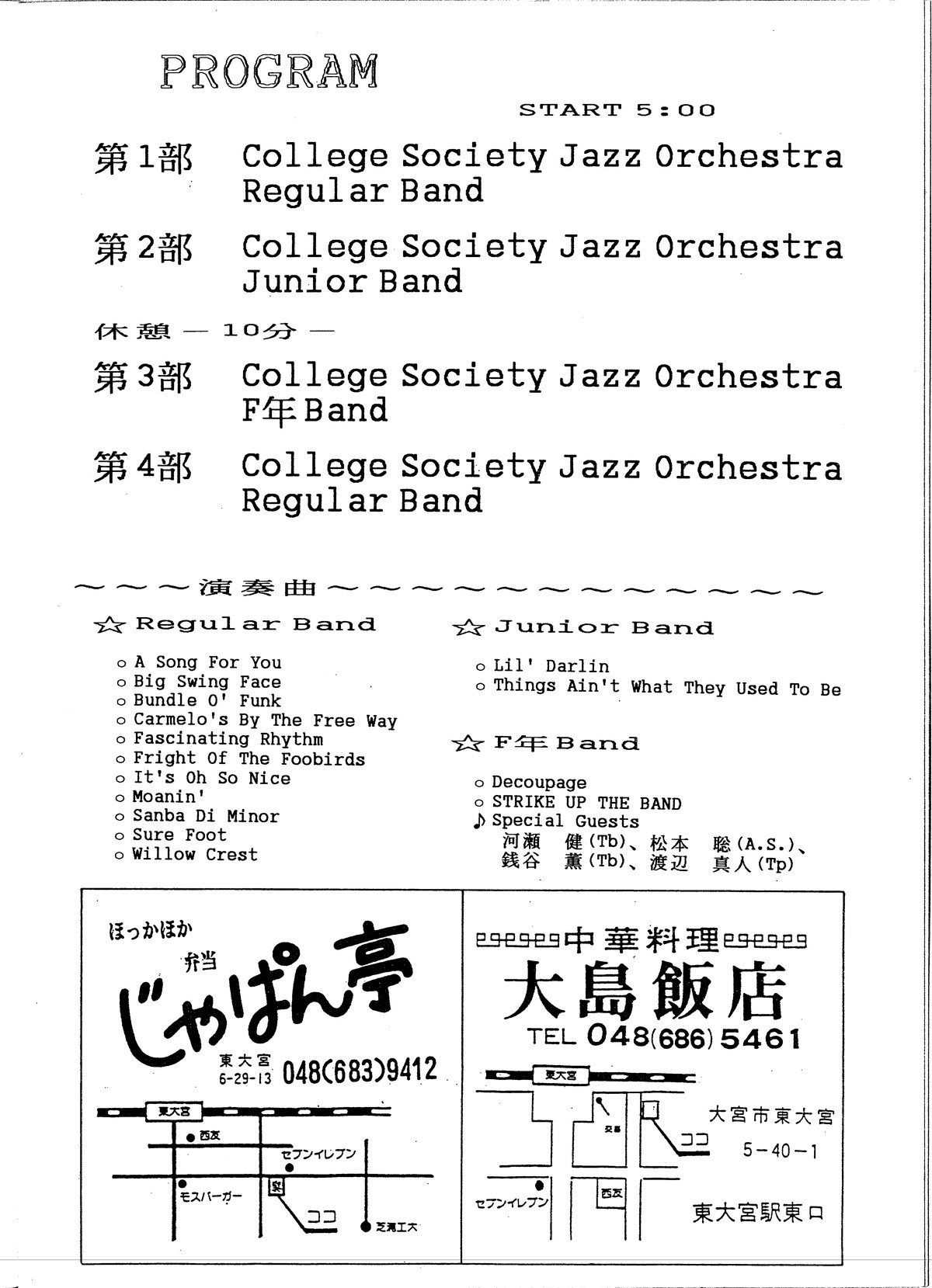 13 | 11 | 5 | 「原信夫 ALL ABOUT シャープ・アンド・フラッツ」コンサート ![]() 日本ジャズ界の代表的バンドや歌手とのコンサートを軽音楽部として企画 ![]() 現在まで続く原信夫氏との縁のはじまり 第2回山野ビッグバンドジャズコンテスト出場 ![]() 日比谷公会堂にて 現在も続くYBBJCもこの年から 第10回定期演奏会 ![]() 大手町農協ホールにて |