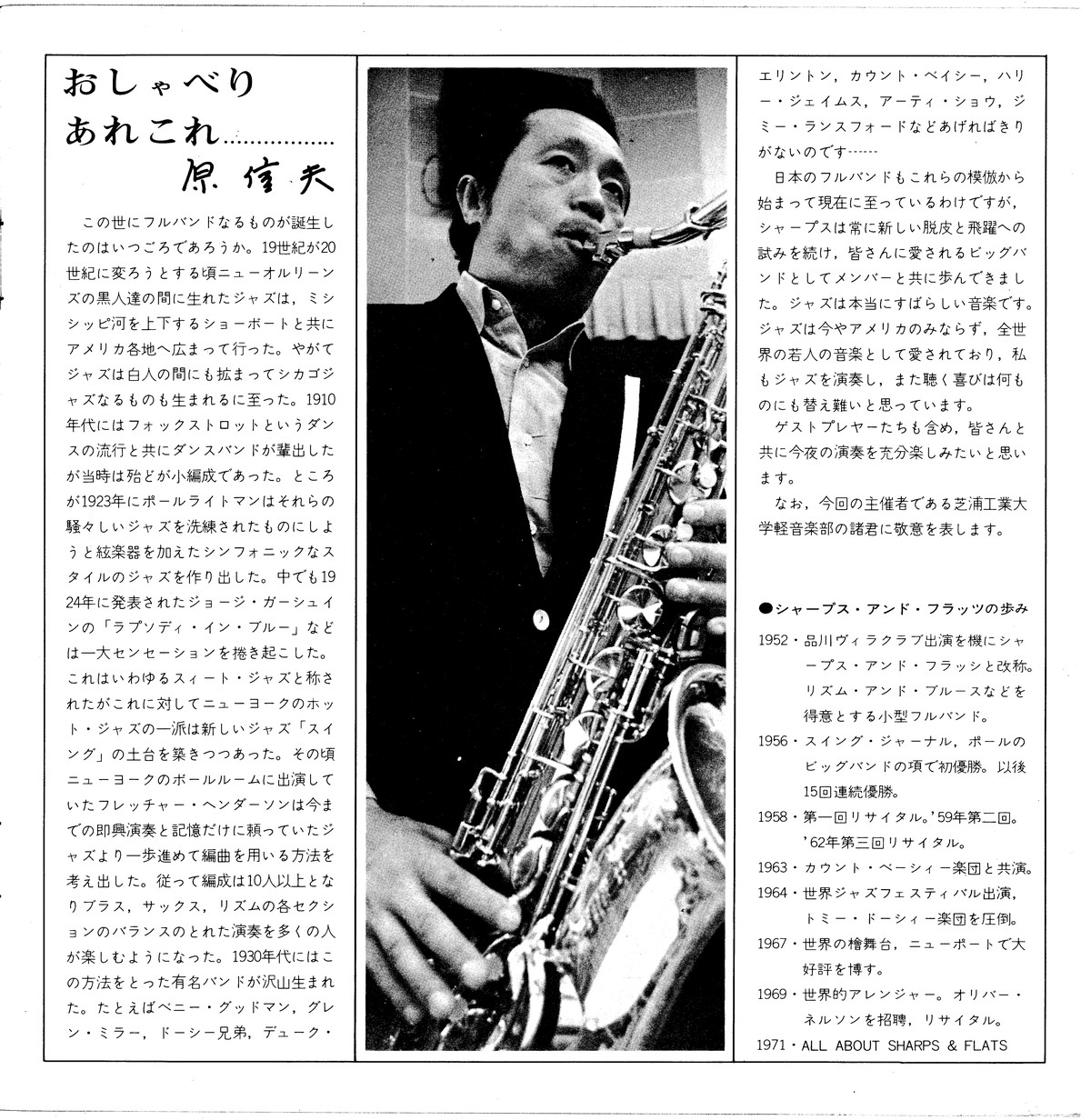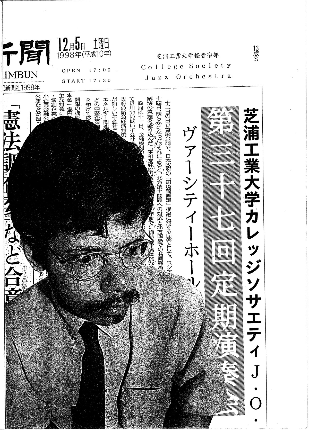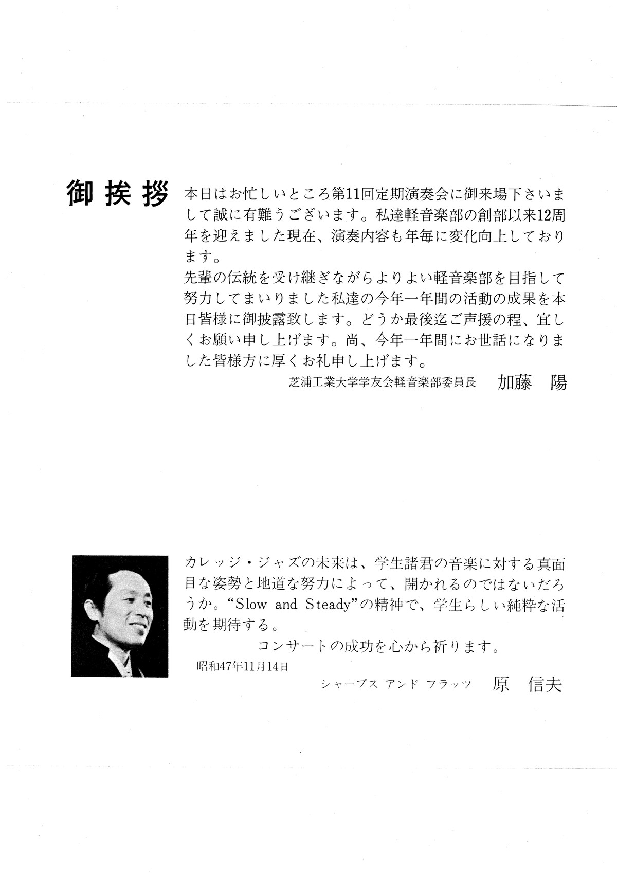 13 | 11 | 5 | 「原信夫 ALL ABOUT シャープ・アンド・フラッツ」コンサート ![]() 日本ジャズ界の代表的バンドや歌手とのコンサートを軽音楽部として企画 ![]() 現在まで続く原信夫氏との縁のはじまり 第2回山野ビッグバンドジャズコンテスト出場 ![]() 日比谷公会堂にて 現在も続くYBBJCもこの年から 第10回定期演奏会 ![]() 大手町農協ホールにて |