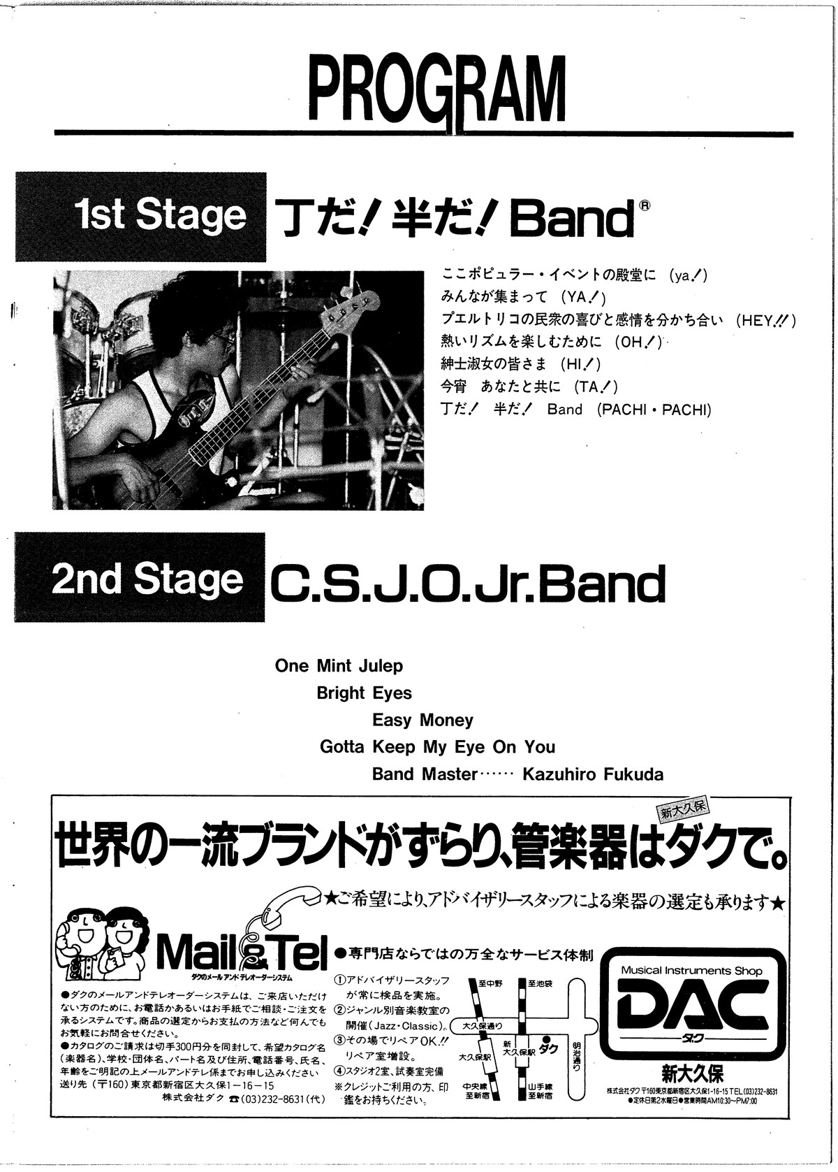 27 | 25 | 19 | 第24回定期演奏会 ![]() 労音会館ホールにて 演奏曲:Carmelo’s By The Freeway/Lazy Day/Mr.Fonebone/Randi など 芝浦・東京工・武蔵・日本工 4工大コンサート ![]() 現在にも続く学バンコンサートの一つ |