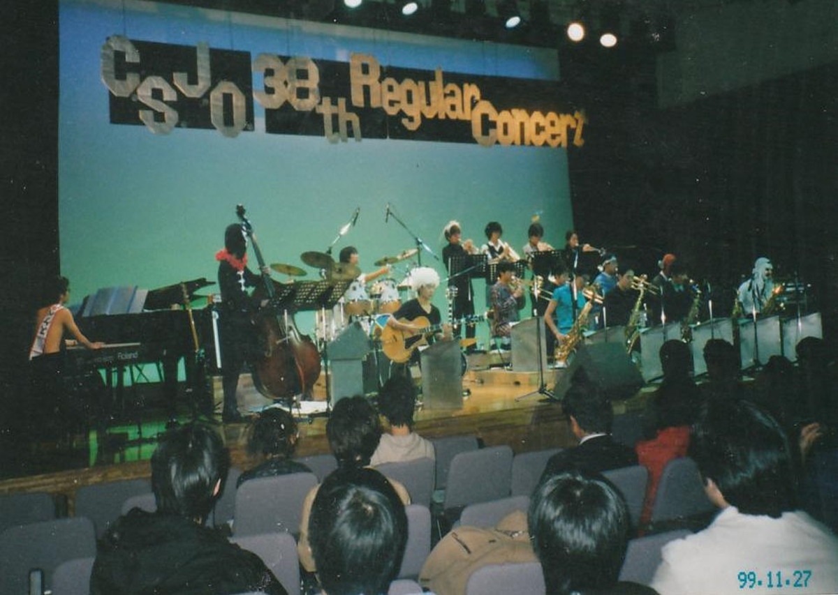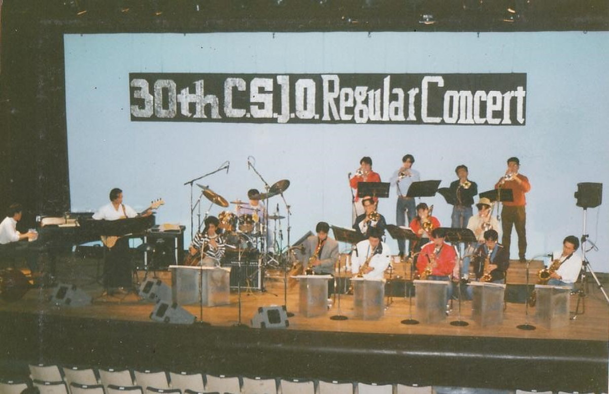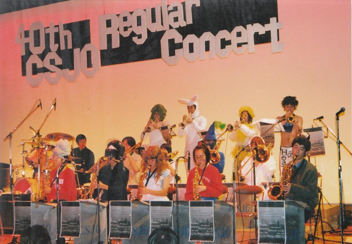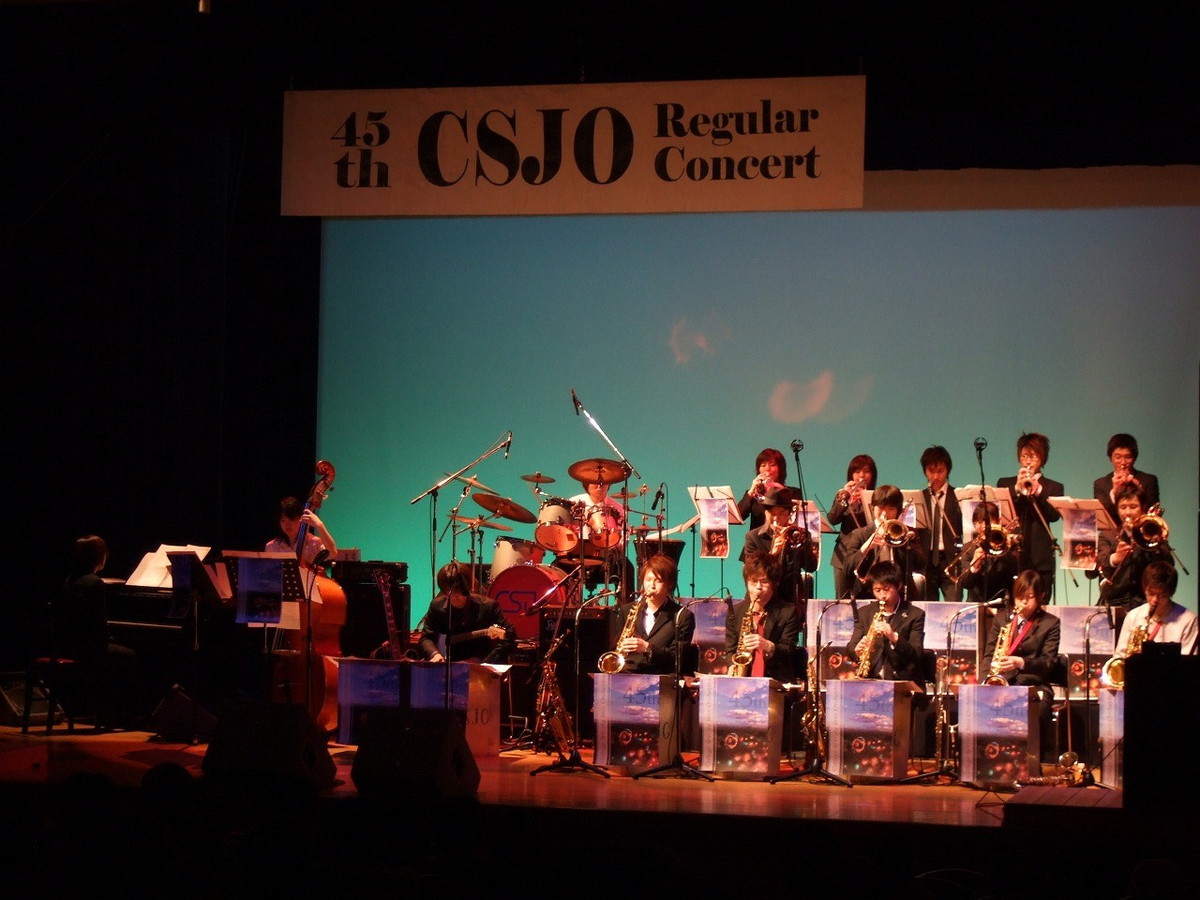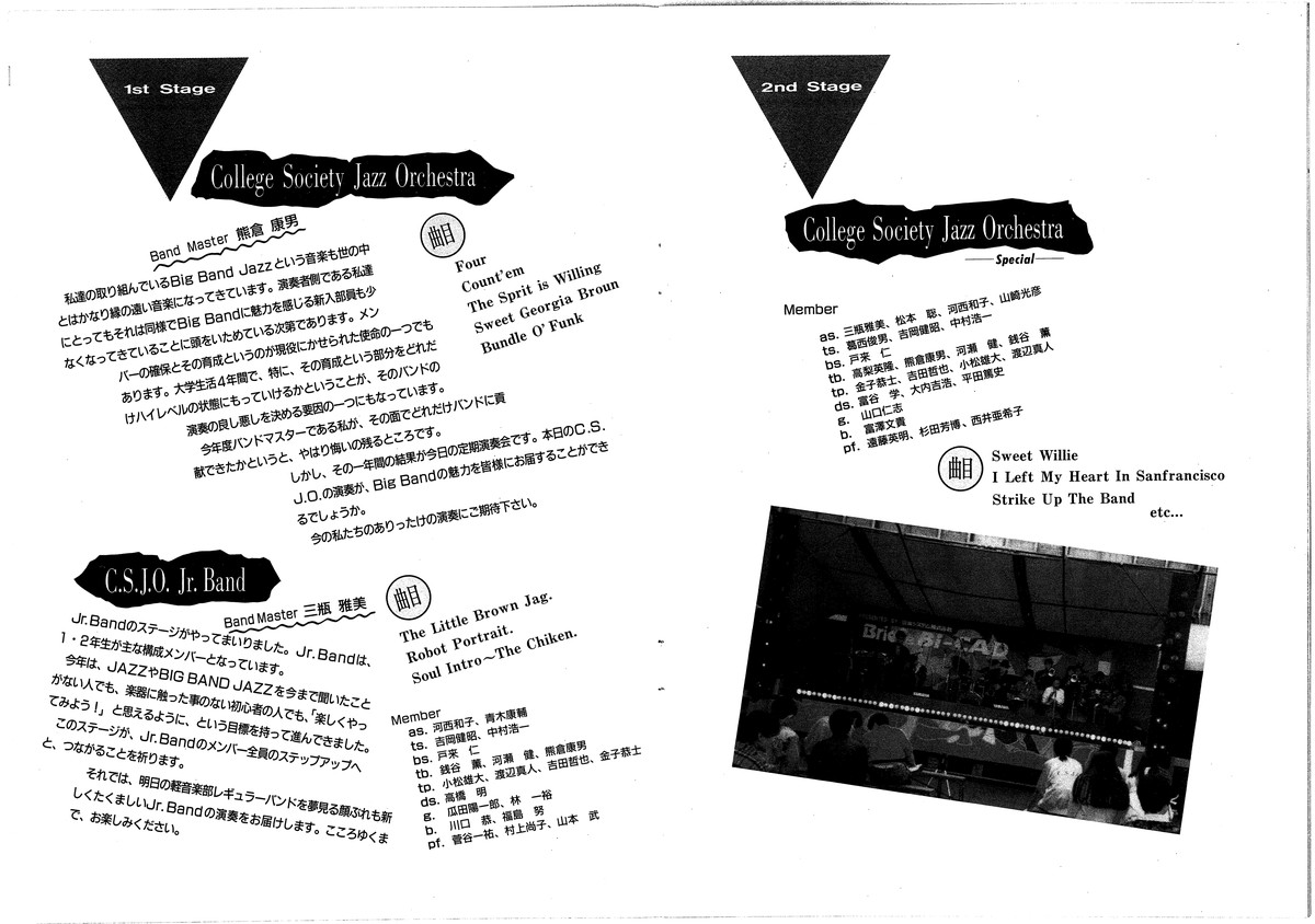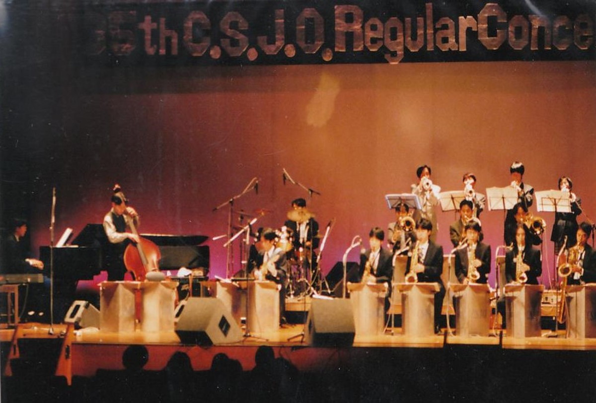 10 | 8 | 2 | 工学祭 College Society Jazz Orchestra 初舞台で演奏 ![]() CSJOとしての初舞台 工学祭で演奏「マウンテン ランブラーズ」 ![]() 屋外での歌モノ演奏 第7回定期演奏会 ![]() 都市センターホールにて この年から定演もコンボ3組とビッグバンドでのプログラム構成に |