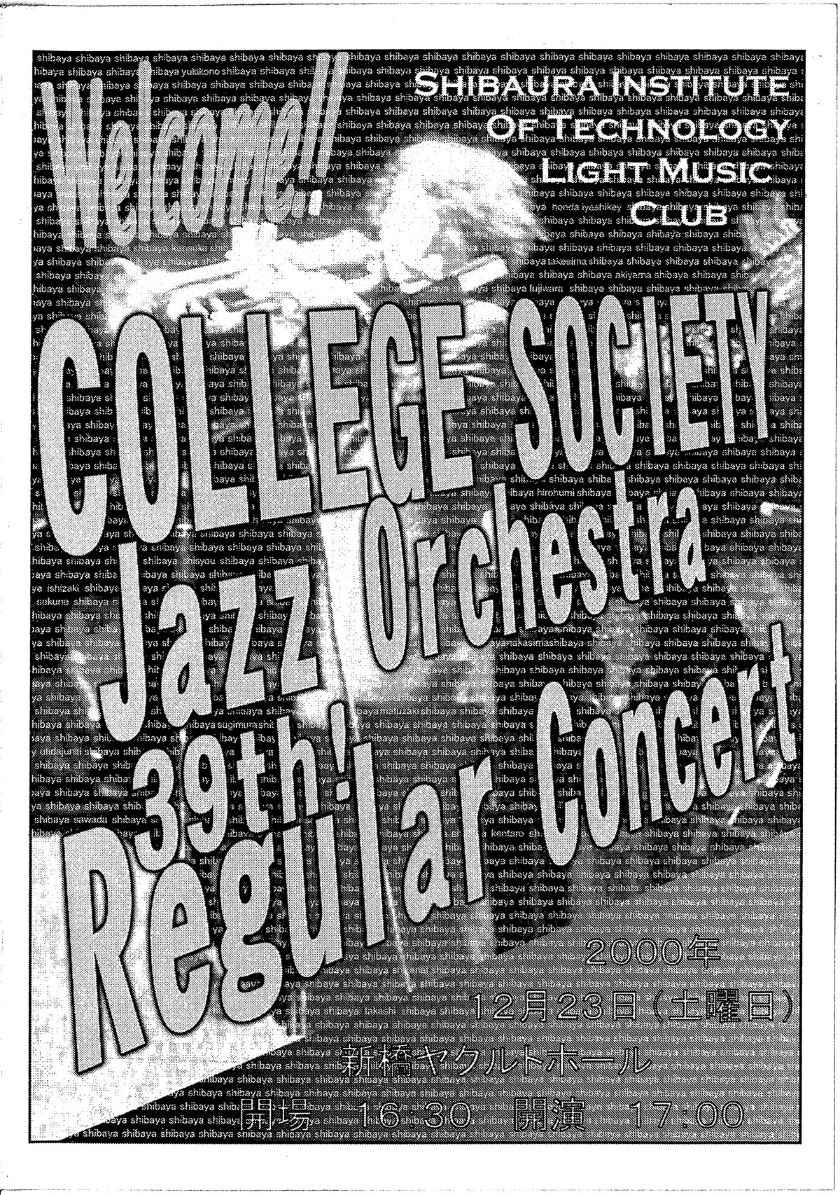 42 | 40 | 34 | 第39回定期演奏会 ![]() 新橋ヤクルトホールにて ![]() パンフレット表紙 演奏曲:Hittin'12/Dolphine Dance/Send in the Crown/Of Space and Time など |