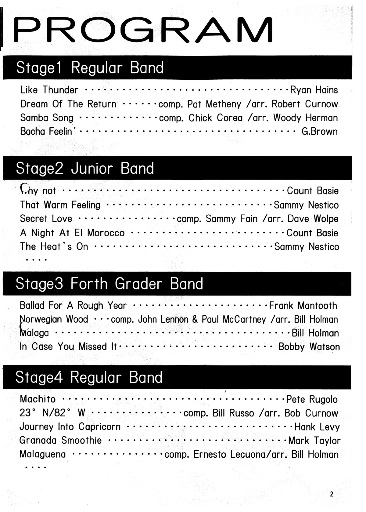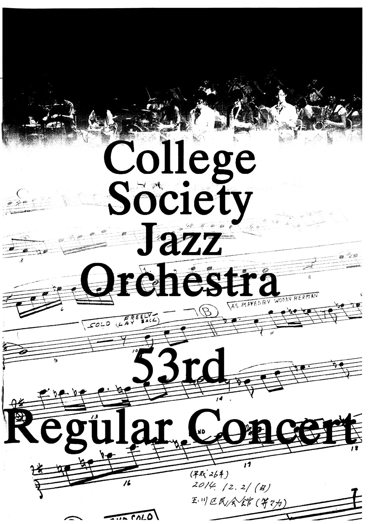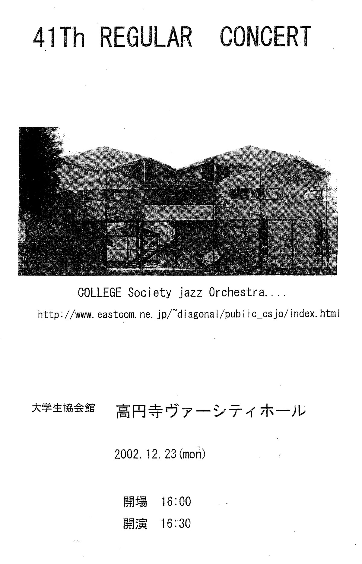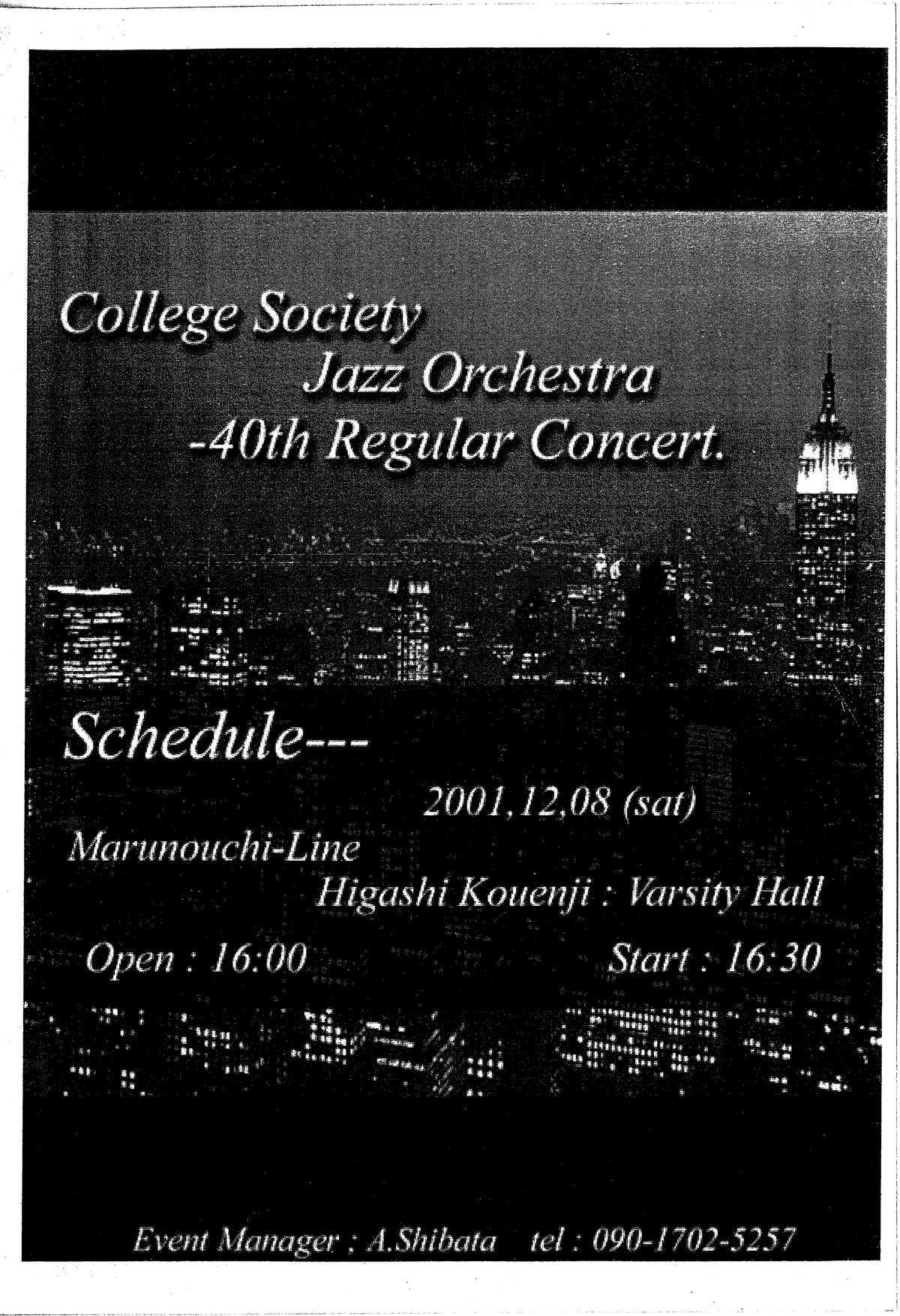 43 | 41 | 35 | 第40回定期演奏会 ![]() 高円寺ヴァーシティホールにて ![]() パンフレット表紙 演奏曲:Elvin’s Mambo/Back in Town/Flight of the Foo Bird/Lament など |