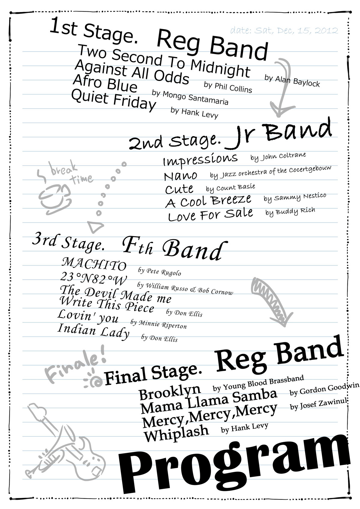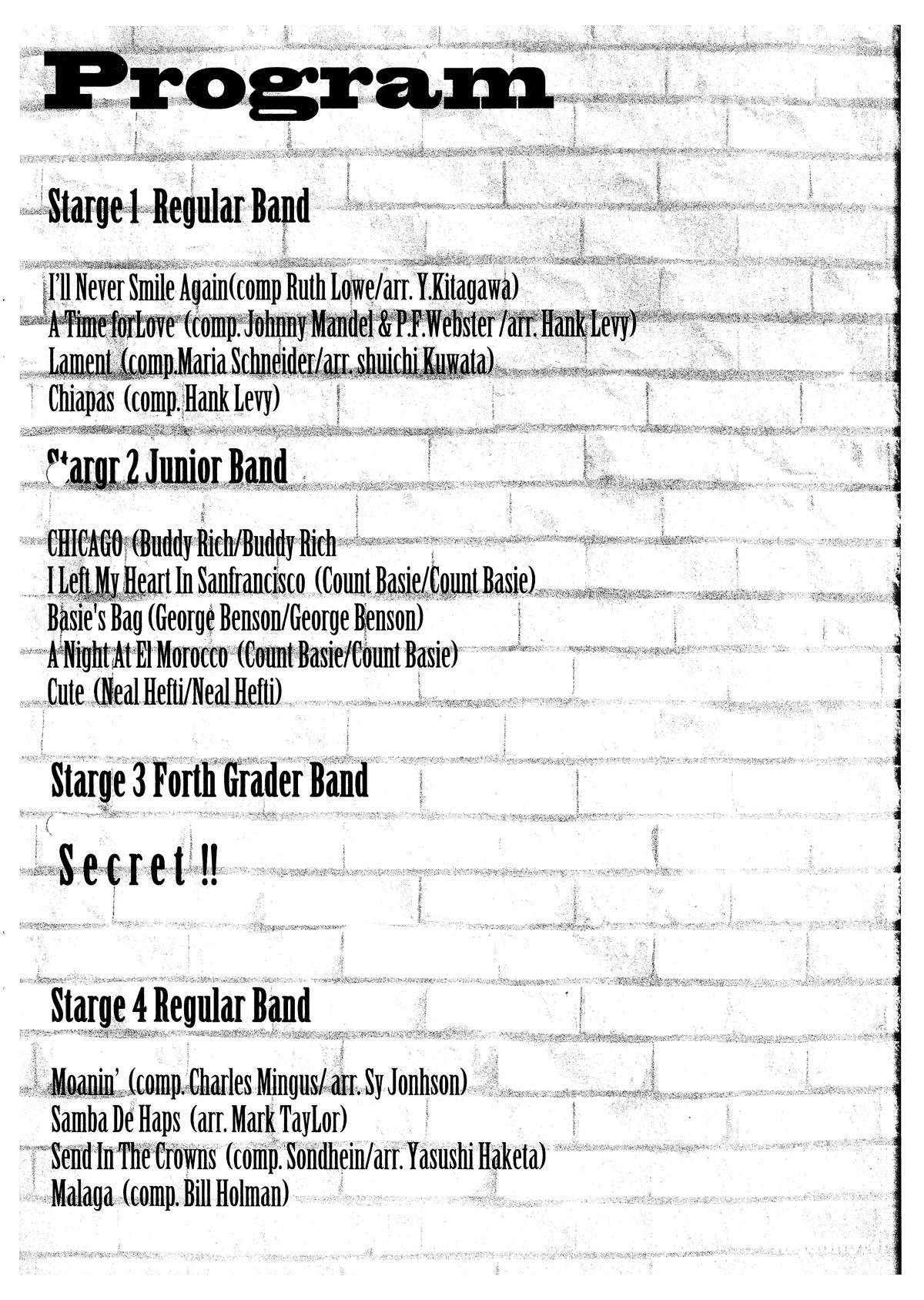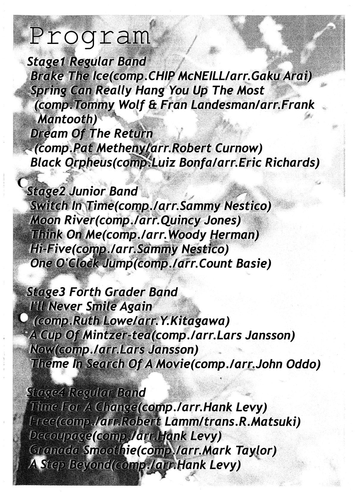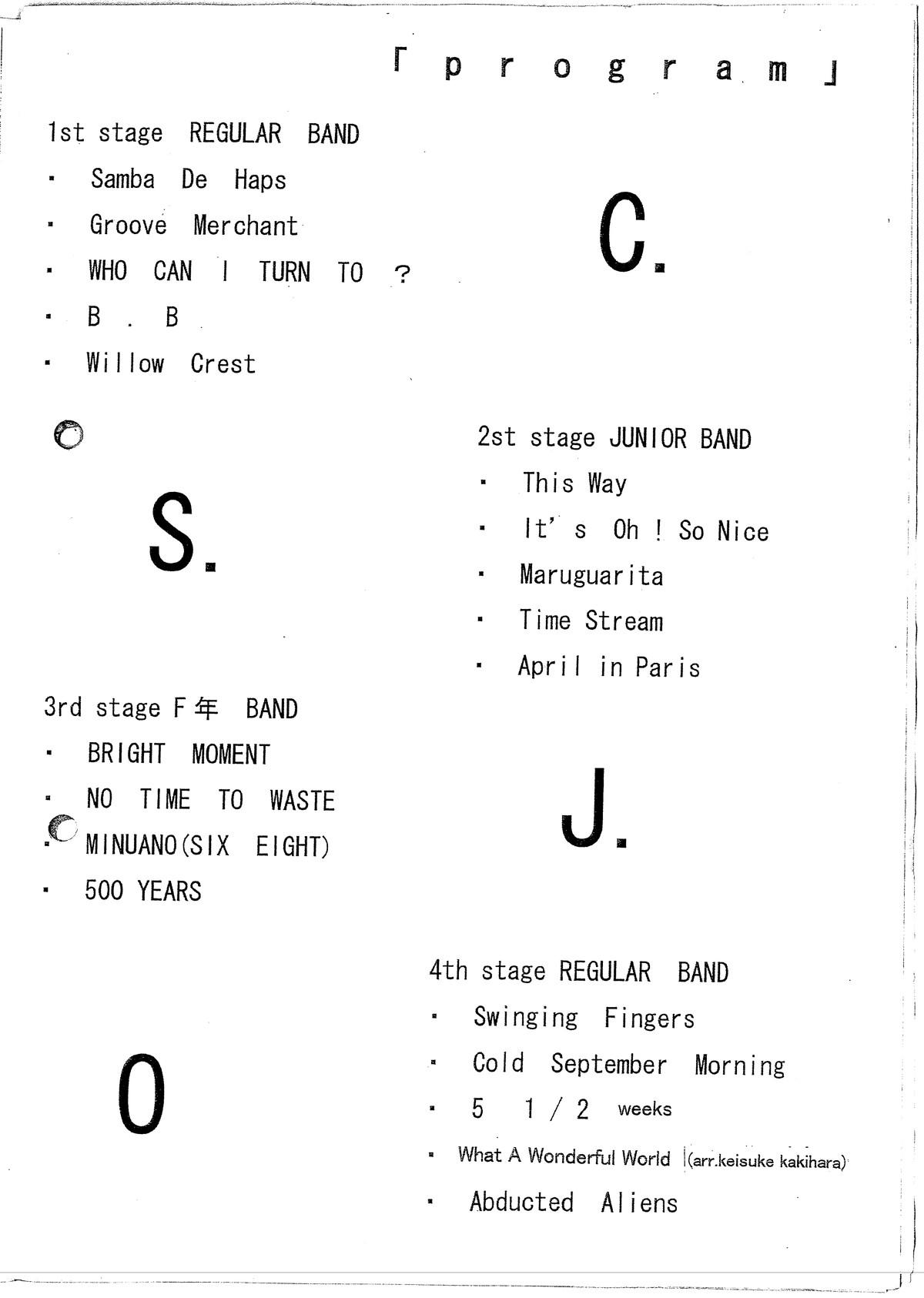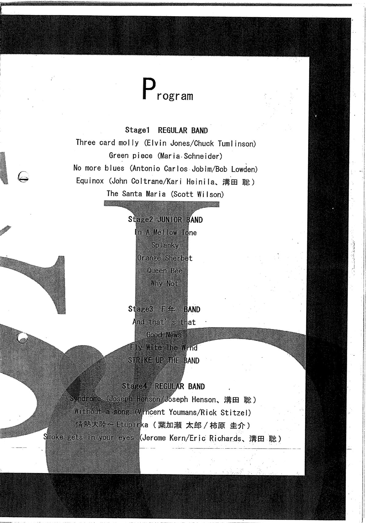 31 | 29 | 23 | 第28回定期演奏会 ![]() 日仏会館ホールにて 演奏曲:You Too/88 Base Street/Jilian/South 21st Shuffle など |