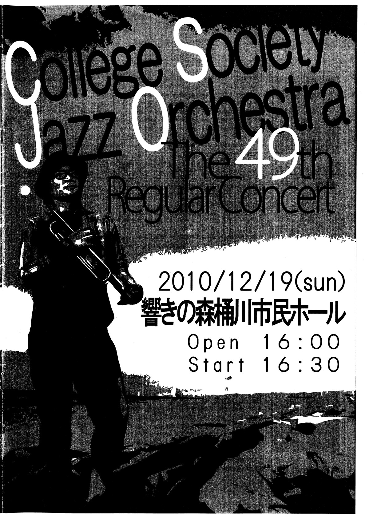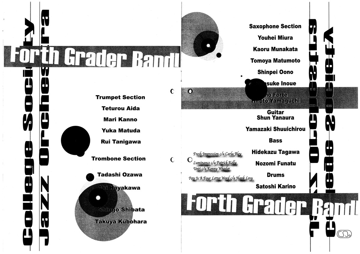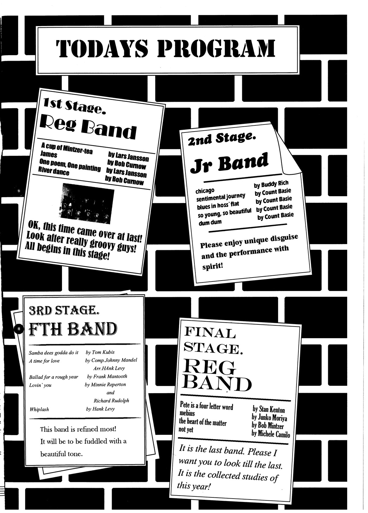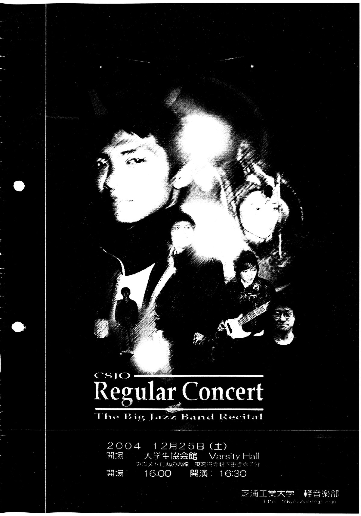 24 | 22 | 16 | 第21回定期演奏会 ![]() 日仏会館ホールにて ![]() パンフレットのイラスト 演奏曲:The Queen Bee/Johnny’s Theme など 第13回山野ビッグバンドジャズコンテスト出場 ![]() |