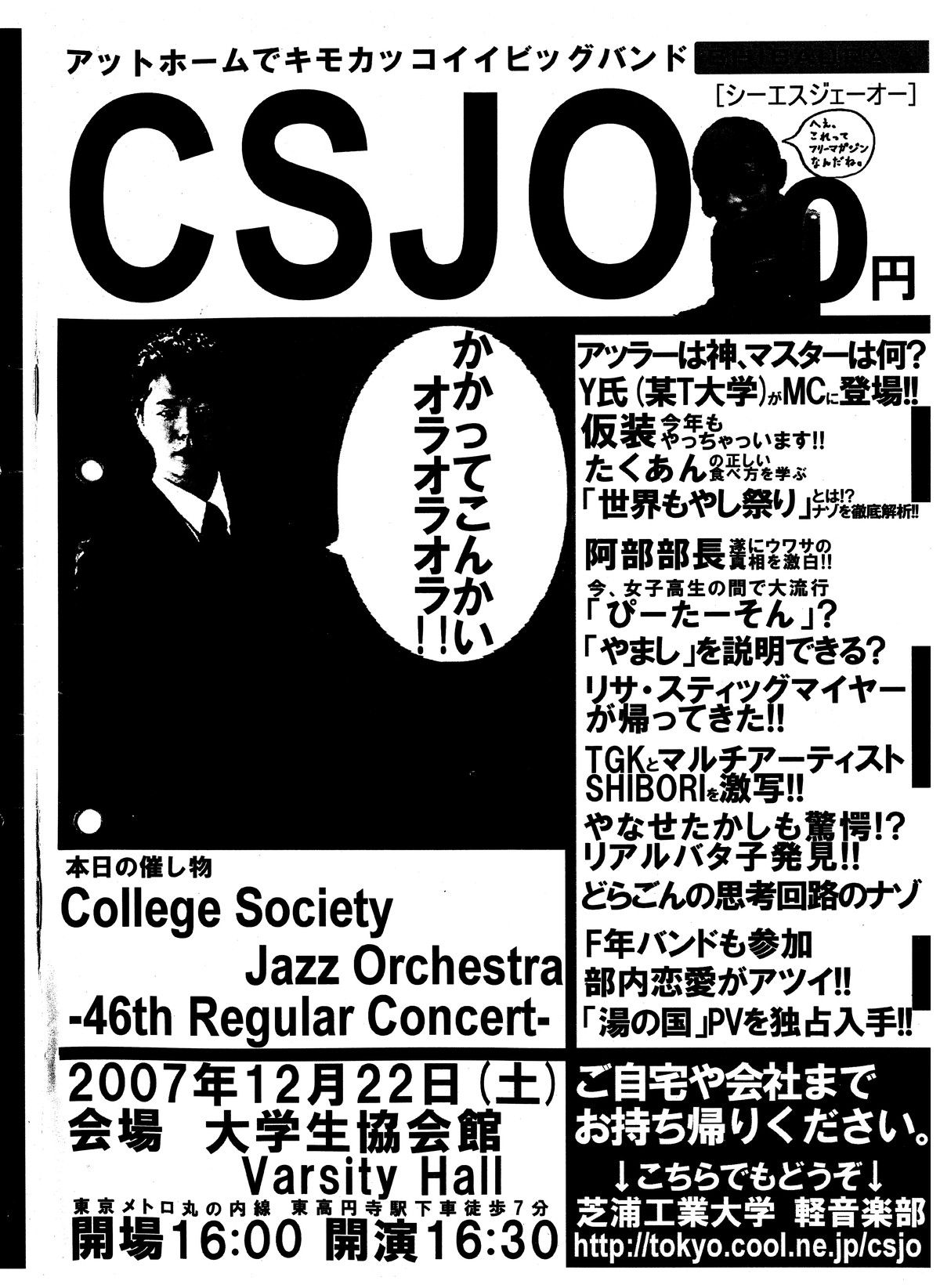36 | 34 | 28 | 第33回定期演奏会 ![]() 日仏会館ホールにて CSJO生お馴染みの大島飯店も協賛に登場 |